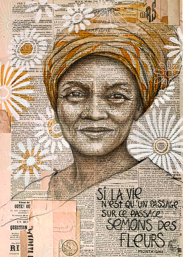 Dessinatrice et graphiste, je dessine des portraits en partant d’un regard. Le support des vieux papiers permet de donner de la vie et de créer des compositions harmonieuses en y mêlant typographies et motifs graphiques.