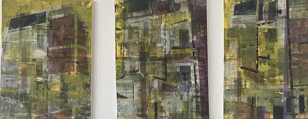 Ce triptyque abstrait évoque une architecture fragmentée, comme un souvenir urbain déconstruit. Par superpositions de formes géométriques et de couleurs terreuses (verts, ocres, bruns, violets), il crée une impression de profondeur et de transparence. Les structures semblent flotter, entre construction et effacement, suggérant le passage du temps. Chaque panneau prolonge les autres, formant un tout cohérent où se mêlent ordre et chaos. L’œuvre invite à la contemplation, entre repères familiers et abstraction silencieuse.