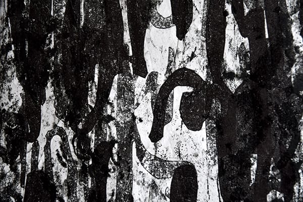 Reprises, multiplications, assemblages, superpositions, passage du grand au petit. Je joue avec les matières. ÉCRITURES D’ÉCORCES, monotypes d’écorces surimprimées d’écritures gravées dans du lino.